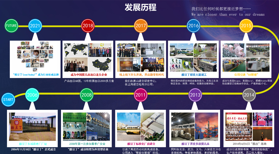 安徽酷豆丁科技發(fā)展股份有限公司,是一家集研發(fā)、設(shè)計(jì)、生產(chǎn)、銷售、策劃、服務(wù)為一體的專業(yè)制造型企業(yè),致力為億萬母嬰家庭提供便捷、優(yōu)質(zhì)、環(huán)保、安全的寶寶用品,并提供專業(yè)化嬰童睡眠和出行解決方案.。公司成立于2006年,2016年改為股份有限公司。作為中國嬰兒床出口龍頭企業(yè),14年專注嬰兒床的研發(fā)與生產(chǎn),產(chǎn)品暢銷海外68個(gè)國家,累計(jì)銷售超過2000多萬張。