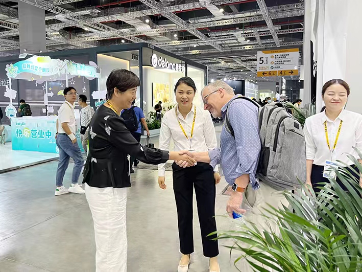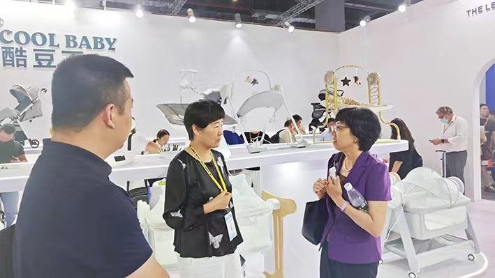 中國玩具協會會長梁會長也到場參觀了酷豆丁嬰兒床、嬰兒車等產品,并與酷豆丁董事長張迎年女士針對產品目標群體、使用場景等話題展開了交流。