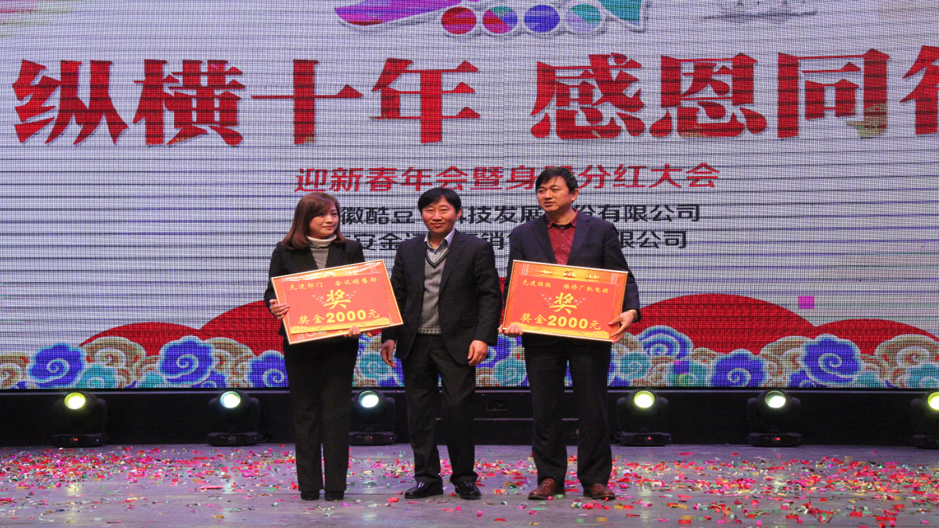 2017年1月18日,安徽酷豆丁迎新春年會暨身股分紅大會在悠然南溪9號大劇院隆重召開, 金安區人民政府副區長王務兵、金安區慈善協會會長彭良國、金安區商務局局長金宗武、 慧聰書院首席法律顧問馮仲實 、孫云領、酷豆丁的董事長張迎年、副總經理張磊、副總經理韓兵以及酷豆丁的全體員工800余齊聚一堂,共襄酷豆丁年度盛會。
