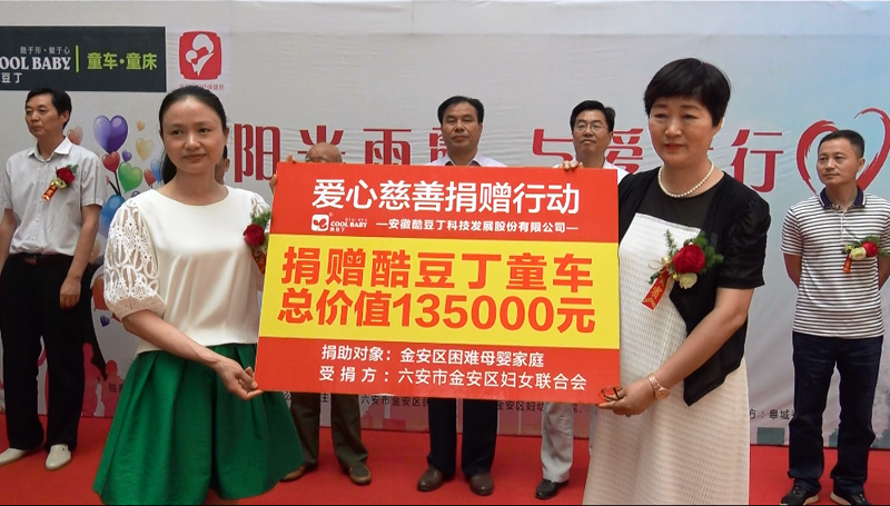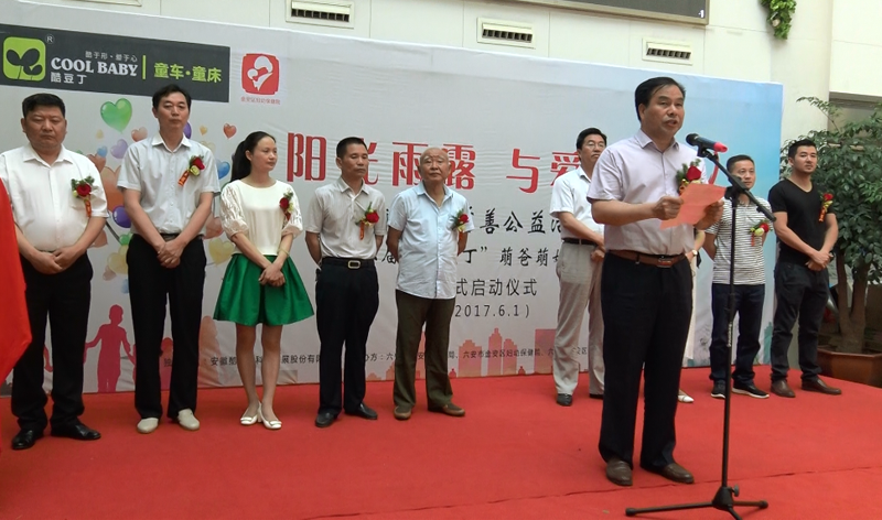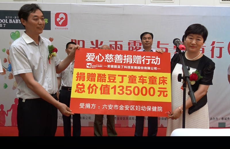 6月1日上午,安徽酷豆丁科技發展股份有限公司2017年“陽光雨露,與愛同行”大型慈善公益活動暨第二屆“酷豆丁”杯萌爸萌媽大比拼活動啟動儀式在六安市金安區婦幼保健院隆重舉行。出席捐贈活動的領導有:六安市金安區副區長王務兵、六安市金安區善總會會長彭良國、六安市金安區民政局局長王俊、六安市金安區衛計委主任王昌盛主任、六安市婦女聯合會主席方燕、六安市金安區婦幼保健院院長張勁松、六安市金安區區委宣傳部副部長丁兵、安徽酷豆丁科技發展股份有限公司董事長張迎年、副總經理韓兵、副總經理張磊。