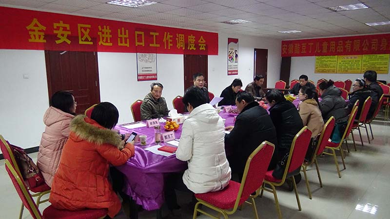 12月24日,金安區(qū)進(jìn)出口工作調(diào)度會在安徽酷豆丁兒童用品有限公司召開。副區(qū)長王務(wù)兵、商務(wù)局局長金宗武及金安區(qū)十幾家外貿(mào)骨干企業(yè)負(fù)責(zé)人參加了會議。