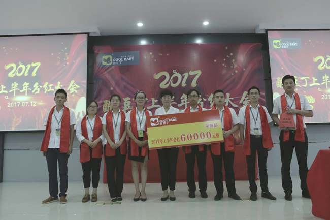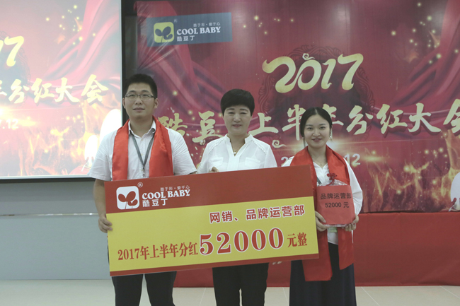酷貝貝兒童用品有限公司領取分紅現金并與酷豆丁董事長合影留念