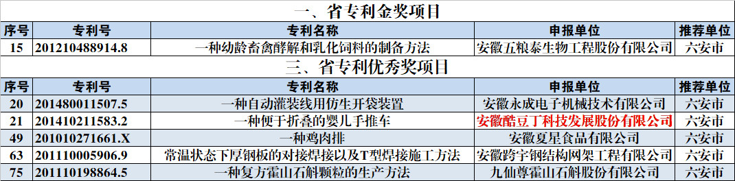 第六屆省專利獎六安市預獲獎名單