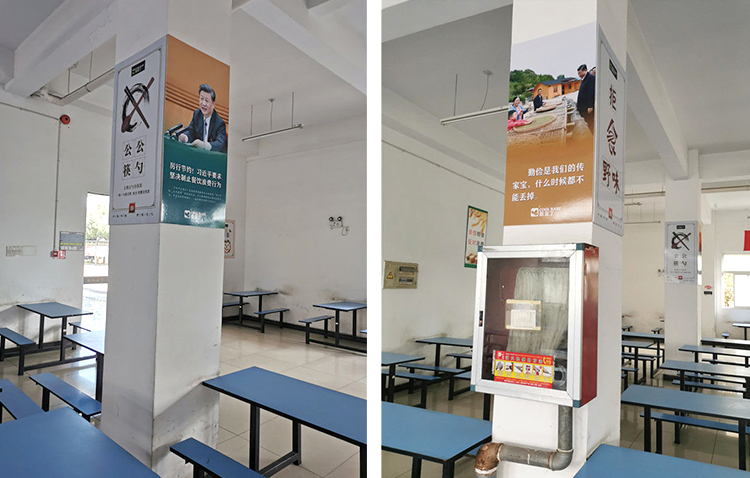 五、講究舉止,愛護設施。自覺愛護餐廳公共設施,做到不蹬踏、不損壞,不將餐具帶出餐廳,不把菜飯帶到寢室。
