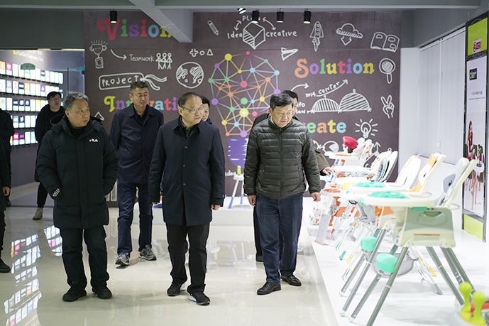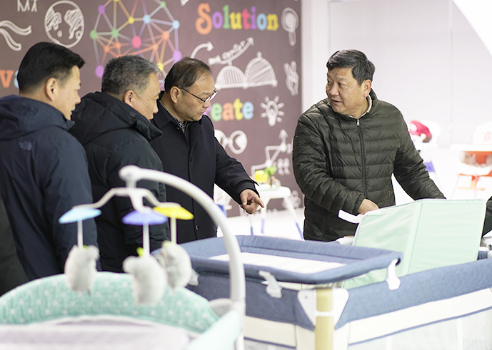 在產品展廳,束學龍一行對酷豆丁獲得中國優秀工業設計獎金獎提名的“一鍵收合嬰兒床”(P100H)和獲得安徽省工業設計大賽金獎的“全地形嬰兒車”(S305)進行了詳細了解,并提出相關建議。