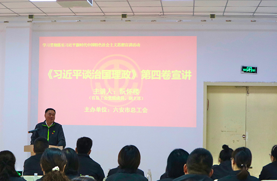 在工會干部宣講階段,阮懷樓身穿酷豆丁公司職工工作服上臺為大家詳細解讀了《習近平談治國理政》第四卷,當天是他在酷豆丁“當一周工人”的最后一天,通過與企業職工共同生活、共同勞動,他的宣講接地氣、深入人心,贏得了廣大職工的喝彩。阮懷樓從“為啥學”“學什么”“怎么做”三個方面向我們分享了學習《習近平談治國理政》第四卷的有關感悟,他強調學習《習近平談治國理政》第四卷有助于我們進一步加深對“中國之路”、“中國之治”、“中國之理”的理解認識,深入學習貫徹《習近平談治國理政》第四卷作為當前和今后一個時期的重大政治任務,必須抓緊抓實,將學習第四卷與前三卷貫通起來,與學習貫徹總書記考察安徽講話的重要指示精神結合起來,切實把學習成果轉化為拉高標桿、奮勇爭先,立足崗位、建功立業的生動實踐。