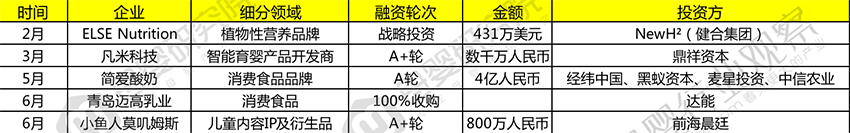 其中,在食品類目,今年2月,健合集團NewH2創新基金宣布對新型植物性營養品牌 Else Nutrition進行 575 萬加元的戰略性投資,后者所主張的基于植物的、非大豆的配方是一種純凈成分,為對配方奶粉不耐受的嬰幼兒和選擇純素家庭帶來更多選擇。此外,以高知媽媽群體為主力用戶人群的簡愛酸奶,在今年5月宣布完成4億人民幣A輪融資,據了解,簡愛創始團隊的爸爸們與3000個家庭共同參與了父愛配方系列酸奶的研發,從營養品質、用戶體驗到口味、包裝,積極提出反饋意見,致力于打造真正符合媽媽和寶寶需求的酸奶。