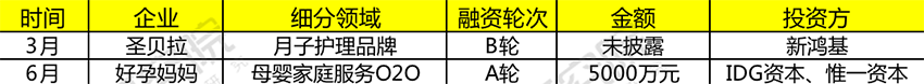 另外,在母嬰護理服務領域,圣貝拉和好孕媽媽再次被資本加持。今年3月,高奢月子護理品牌“圣貝拉”及其母公司“貝康國際”宣布完成B輪融資,融資金額未透露本輪由香港上市公司新鴻基獨家戰略投資,融資后估值近一億美金。據了解,圣貝拉主打親資產直營模式,目前已全國完成一線城市布局,創始人向華表示,本輪融資主要用于門店擴張、線上家庭健康管理,以及全產業鏈數字化的持續升級。另外一家母嬰家庭供應商好孕媽媽在今年6月完成5000萬元A輪融資,由惟一資本和IDG資本共同投資。好孕媽媽主要從母嬰職業教育切入,通過師資打造以及教研體系的研發,建立標準化的課程體系并通過培訓,提高月嫂、育嬰師等相關人員的職業技能;并延伸至家庭服務領域,并輔以各類增值服務,譬如上門產后修復、新生兒攝影拍照、家庭早教服務等。
